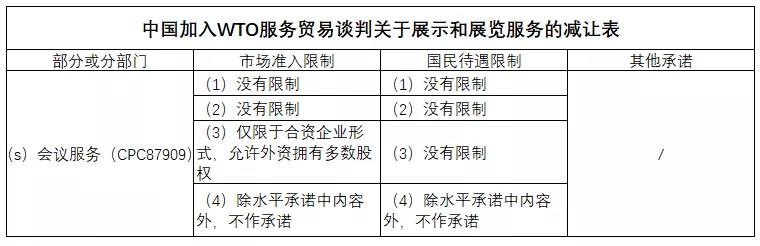 在开放市场方面,2001年11月,中国政府签署的《加入世贸组织议定书》附件九《中华人民共和国服务贸易具体承诺减让表》中对商业服务、金融、电信、建筑、分销、旅游、交通等服务贸易领域开放作出相关规定,其中会议展览服务业属于完全对外开放领域。