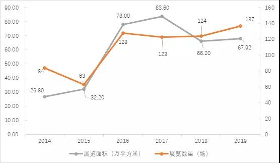 据统计,2014年至2019年中国主办方境外办展整体呈增长态势。与2014年相比,2019年中国主办方境外办展数量增长超六成,面积增长为2014年办展面积的1.53倍。