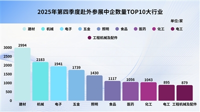 这一特征可通过第四季度赴外参展中企数量TOP10大行业情况得以体现。这十大行业分别为:建材(2294家)、机械(2183家)、电子(1941家)、五金(1739家)、照明(1430家)、食品(1117家)、医药(1056家)、化工(1043家)、电工(895家)、工程机械及配件(879家)。同时,第四季度赴外参展中企数量TOP10的小行业数据亦值得关注,分别为:其他电子(1101家)、其他照明(688家)、塑料(534家)、建筑玻璃(505家)、医疗设备(390家)、门窗五金(374家)、其他工艺品礼品(360家)、其他五金(342家)、其他食品(282家)、家用电器(274家)。