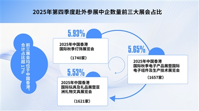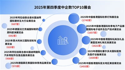 2025年第四季度,展会参展格局出现明显变化。2025年中国香港国际秋季灯饰展览会以1740家内地企业参展的成绩新入TOP10排名并跃居首位;2025年中国香港国际秋季电子产品展暨国际电子组件及生产技术展览会参展企业数量降至1657家,排名滑落至第二位;2025年中国香港国际玩具及礼品展暨亚洲礼物文具展览会首次跻身TOP10排名,内地参展企业达1621家。此外,德国杜塞尔多夫国际医院及医疗设备展览会的内地参展企业数量降至1600家,排名跌出前三,退居第四位。