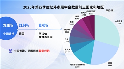 第四季度赴外参展中企数量TOP10国家和地区分别是中国香港地区(7236家)、德国(5632家)、阿拉伯联合酋长国(3288家)、土耳其(1447家)、日本(1360家)、俄罗斯(1323家)、美国(1091家)、越南(1041家)、意大利(1023家)、印度尼西亚(1002家)。在前十榜单的前三大参展目的地中,参展商数量占比前三的分别为中国香港地区(29.6%)、德国(23.04%)、阿拉伯联合酋长国(13.45%)。