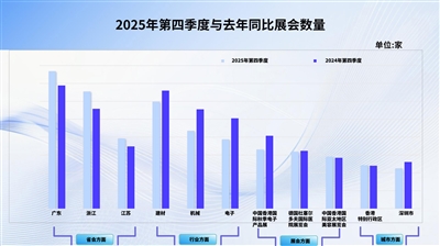 对比2024年同期,2025年第四季度中企赴外参展呈现五方面变化。具体从省份、行业、展会、国家和地区、城市五个维度展开分析。