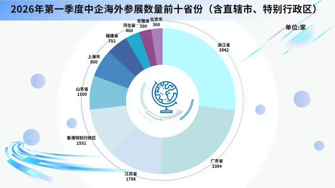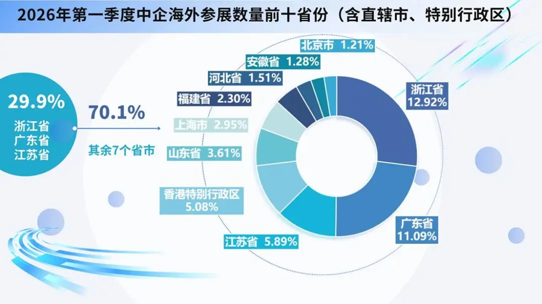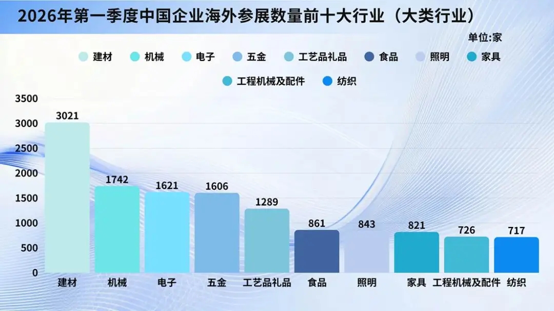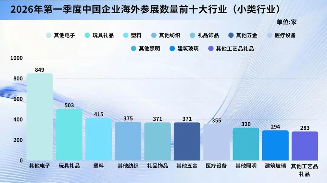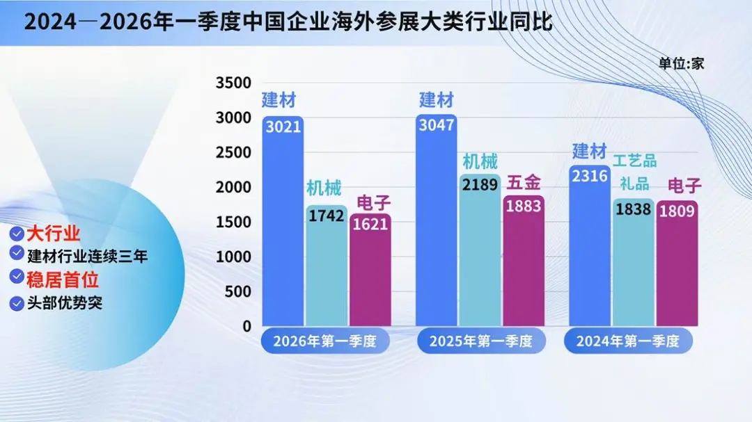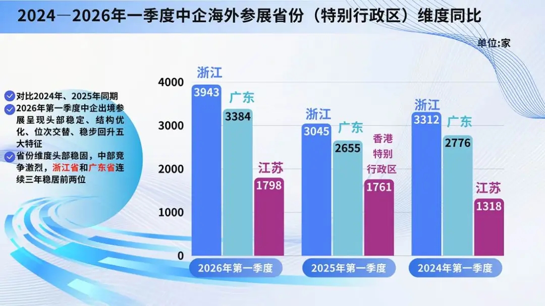对比2024年、2025年同期,2026年第一季度中企出境参展呈现头部稳定、结构优化、位次交替、稳步回升四大特征。