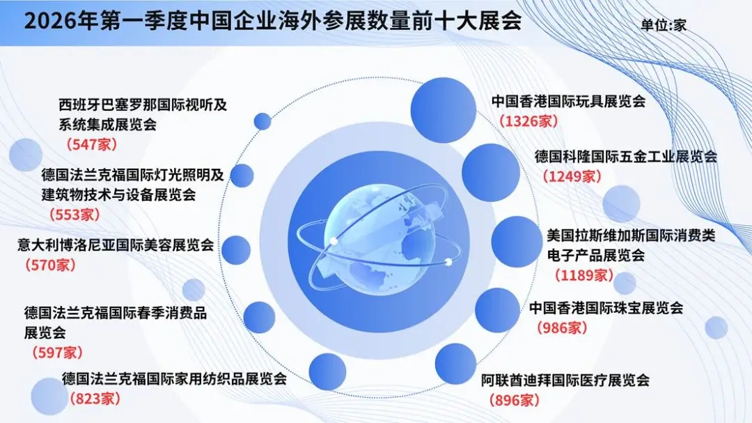 2026年,中国企业出境参展热度前三的展会分别为:中国香港国际玩具展览会(1326家)位居首位,德国科隆国际五金工业展览会(1249家)位列第二,美国拉斯维加斯国际消费类电子产品展览会(1189家)排名第三。