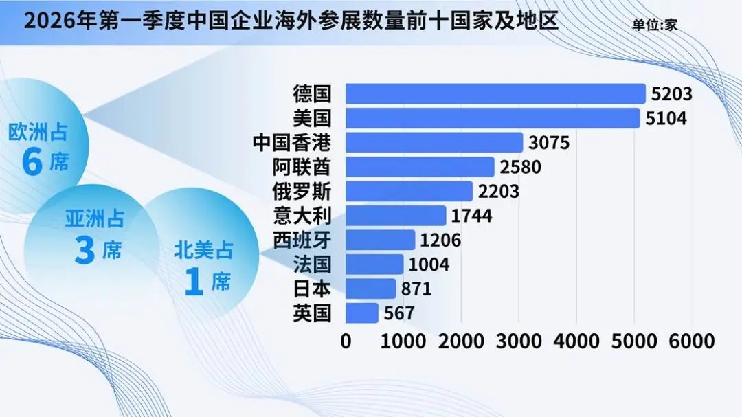 2026年第一季度中企赴外参展目的地TOP10为:德国(5203家)、美国(5104家)、中国香港(3075家)、阿联酋(2580家)、俄罗斯(2203家)、意大利(1744家)、西班牙(1206家)、法国(1004家)、日本(871家)、英国(567家)。