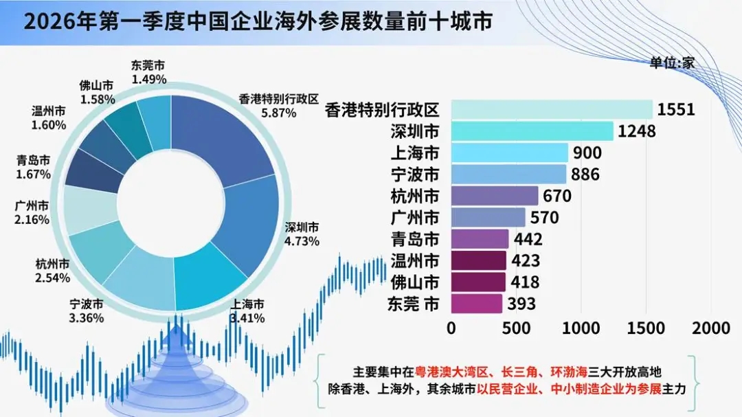 2026年第一季度,赴外参展企业数量TOP10城市(特别行政区)依次为:香港特别行政区(1551家)、深圳市(1248家)、上海市(900家)、宁波市(886家)、杭州市(670家)、广州市(570家)、青岛市(442 家)、温州市(423家)、佛山市(418家)、东莞市(393家)。