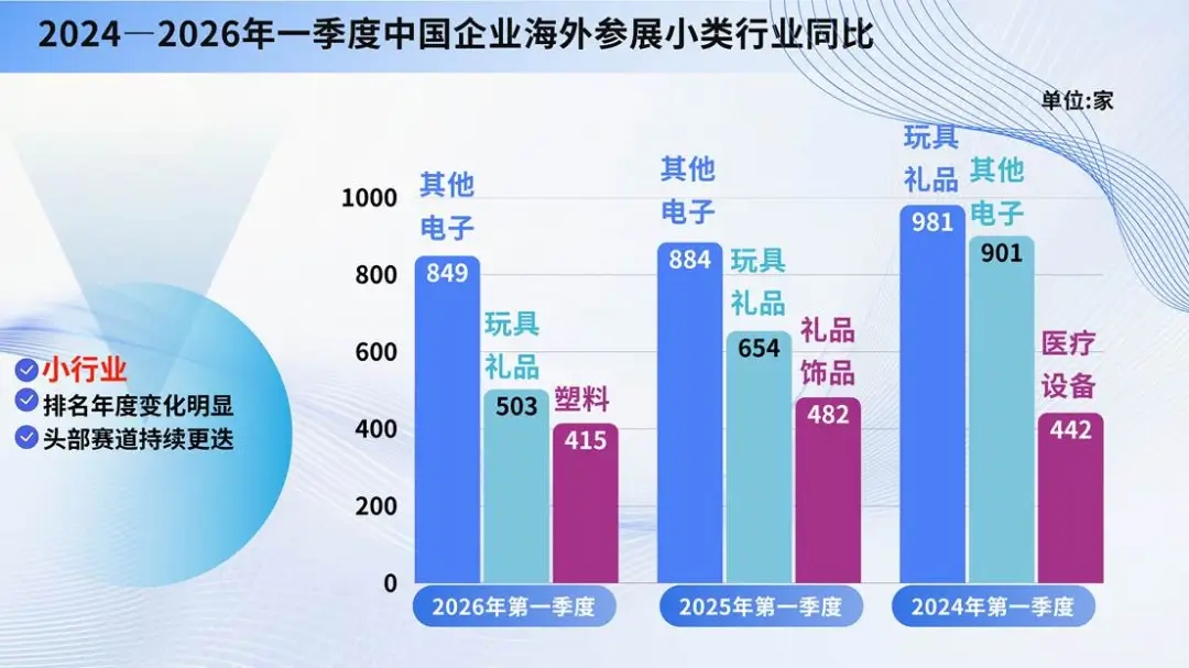 整体来看,其他电子、玩具礼品行业连续三年位居小行业前列,成为出境参展最活跃细分领域。