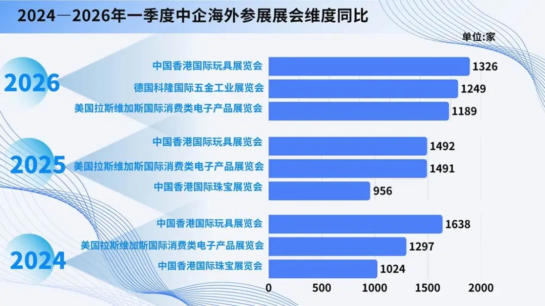 2024年至2026年第一季度,香港玩具展连续三年位居榜首,成为中企出境参展首选;美国消费电子展连续三年进入前三,香港珠宝展常年上榜,头部展会格局稳定。