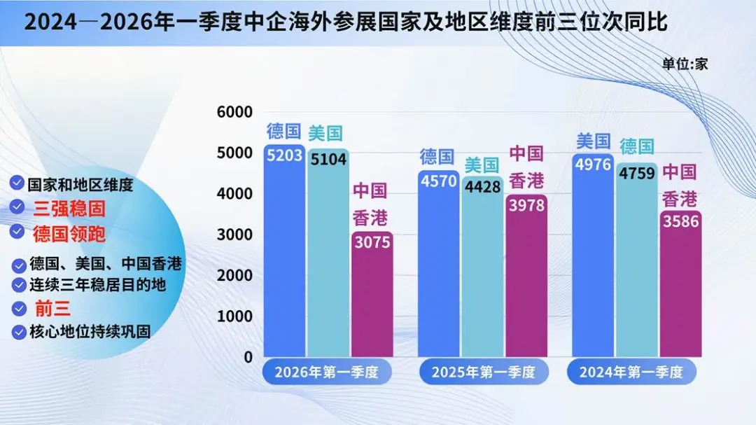 2026 年第一季度,中企出境参展目的地前三为:德国(5203家)、美国(5104家)、中国香港(3075家);2025 年同期为:德国(4570家)、美国(4428家)、中国香港(3978家);2024 年同期为:美国(4976家)、德国(4759家)、中国香港(3586家)。