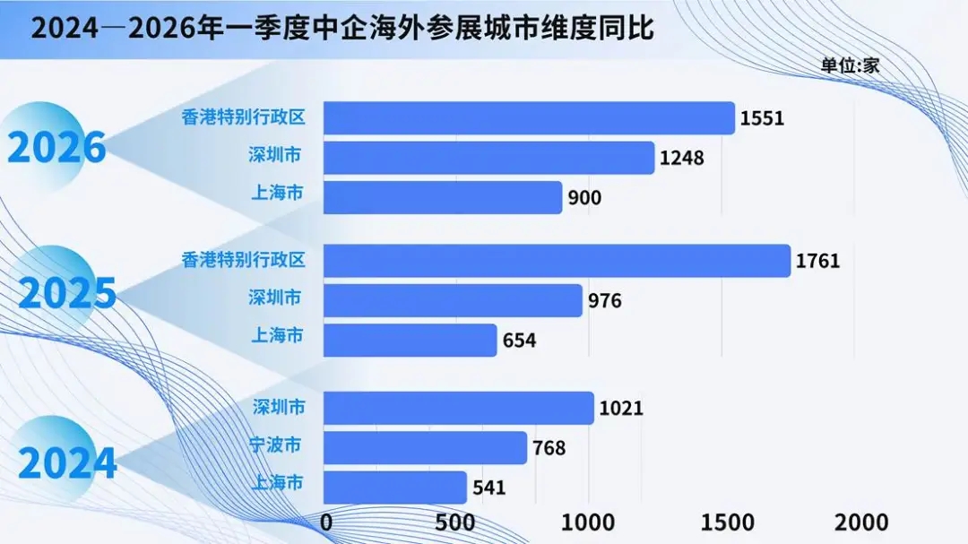 2026年第一季度,出境参展企业数量前三城市为:香港特别行政区(1551家)、深圳市(1248家)、上海市(900家)。2025年同期前三名为:香港特别行政区(1761家),深圳市(976 家),上海市(654家)。2024年同期前三名为:深圳市(1021家),宁波市(768家),上海市(541家)。